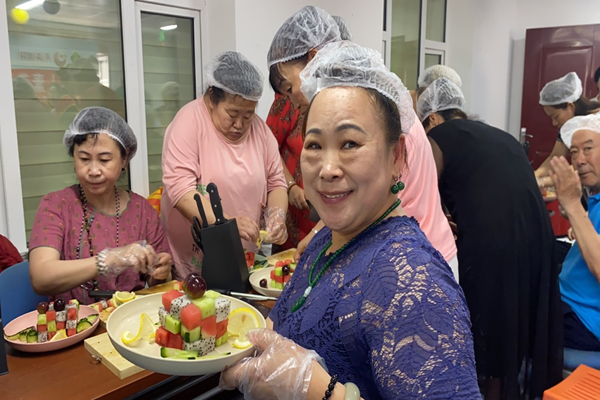 夏天的水果最为丰富也最适合做各种各样的造型,志愿者给大家分发水果的时候老师就讲解了水果如何切,切出什么样的形状,学员们看的津津有味,都迫不及待想一展身手,老师讲解完,学员们开始操作,每个人都认真仔细的回想老师讲的内容遇到困难就找志愿者帮忙,很快一个个水果拼盘就制作成功了,看着自己的作品每个人都露出了自信的笑容。