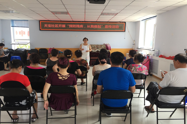 在红旗街道天宝社区活动室,红旗街道志愿者为辖区居民普及残疾预防宣传知识,向居民发放残疾预防、食品安全、药品安全、生产安全、交通安全、消防安全、灾害预防等宣传资料,宣传党和国家对残疾预防的重视,呼吁全社会共同参与。