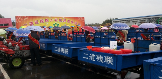 天虽然下着大雨,但是丝毫不减残疾人朋友们内心的热情,残疾人代表高兴地说,有了农机具,他们再也不愁春种、秋收了!