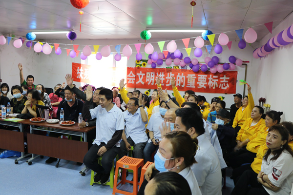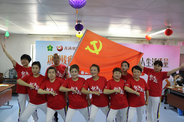 统一的服装、整齐的舞蹈,一位位残障人士跟着乐曲和歌声挥舞着手中的小拍手,在活动现场,来自阿甘艺术团的演员们表演了精彩的歌舞节目,他们坚定的眼神,打动了每一位观众。舞蹈《没有共产党就没有新中国》是他们向我党一百周年的献礼;接下来的残疾人大合唱《我们走在大路上》《社会主义好》和《感恩歌》更向全社会表达了残疾人自强不息、身残志不残的精神风貌;手语舞《明天会更好》作为现场的结束节目,憧憬着美好的未来,赢得了观众阵阵掌声和赞叹声。现场还设置了党史知识和《中华人民共和国残疾人保障法》问答环节,并给每一位答对的残疾人发放了奖品和礼品,活动结束后,示范园为残疾人播放了电影《建国大业》和《开国大典》。