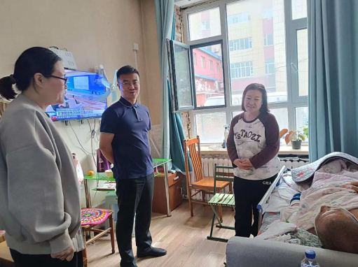 张玉明现年64岁,肢体2级重度残疾,独居在二道区医院附近的一处公寓房内;突发疾病卧床后,由其妹妹张玉艳照料。金石主任和奥南书记亲切探望了张玉明,并与其妹妹张玉艳悉心交谈,详细询问张玉明的身体恢复、日常起居、康复需求等情况,并亲切问候悉心照料哥哥的张玉艳。了解到张玉明无妻子儿女,依靠低保金生活,两位领导亲自为家属送上慰问金,以表关心和爱护。